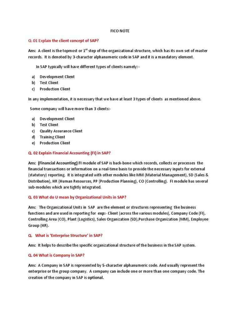 Q. 02 Explain Financial Accounting (FI) in SAP? Ans: (Financial Accounting) FI module of SAP is back-bone which records, collects or processes the financial transactions or information on a real-time basis to provide the necessary inputs for external (statutory) reporting. It is integrated with other modules like MM (Material Management), SD (Sales & Distribution), HR (Human Resources, PP (Production Planning), CO (Controlling). FI module has several sub-modules which are tightly integrated. Q. 03 What do U mean by Organizational Units in SAP? Ans: The Organizational Units in SAP are the element or structures representing the business functions and are used in reporting for exp:- Client (across the various modules), Company Code (FI), Controlling Area (CO), Plant (Logistics), Sales Organization (SD),Purchase Organization (MM), Employee Group (HR). Q. What is Enterprise Structure in SAP? Ans: It helps to describe the specific organizational structure of the business in the SAP system. Q. 04 What is Company in SAP? Ans: A Company in SAP is represented by 5-character alphanumeric code. And usually represent the enterprise or the group company. A company can include one or more than one company code. The creation of the company in SAP is optional.