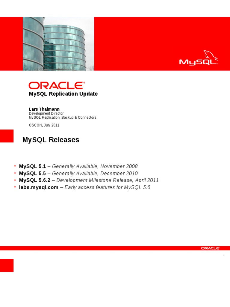 MySQL 5.6.2 Development Milestone Replication Features 1. Crash-safe slave replication info tables 2. Crash-safe master binary log recovery 3. Replication event checksums 4. Time delayed replication 5. Optimized row-based logging 6. Informational log events 7. Remote backup of binary logs 8. Server UUIDs Replication topology detection
