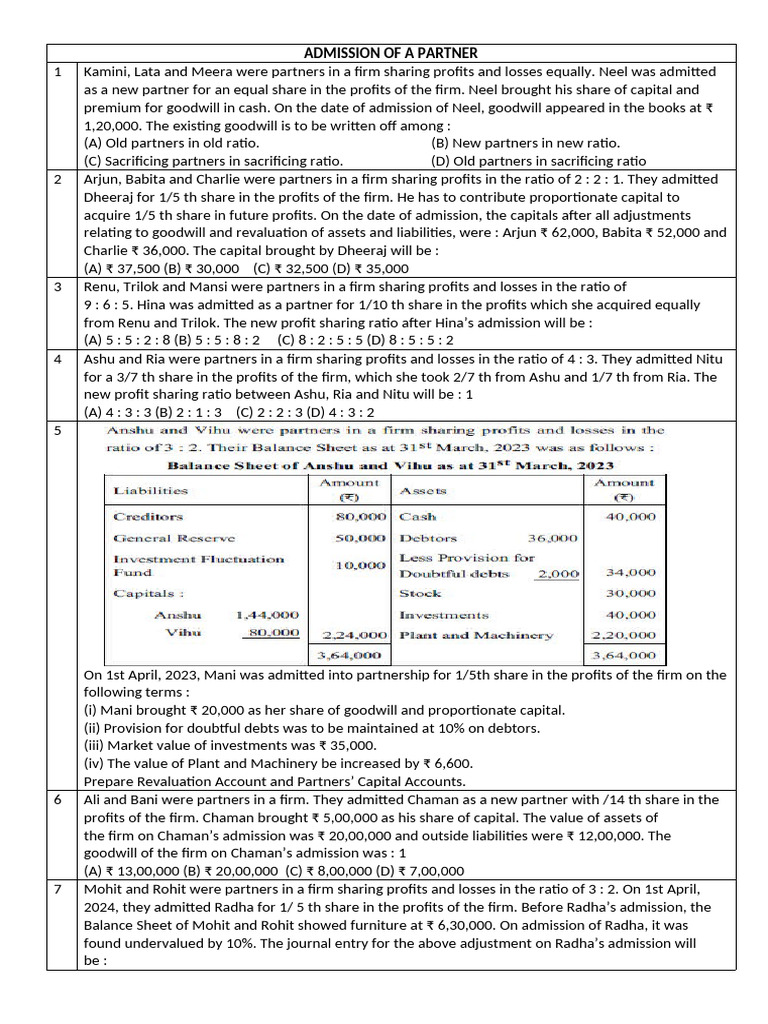 2024, they admitted Radha for 1/ 5 th share in the profits of the firm. Before Radha’s admission, the