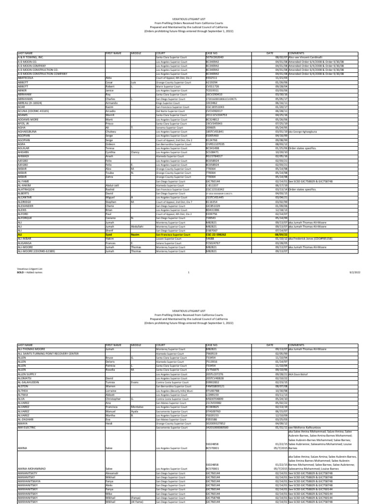 LAST NAME FIRST NAME MIDDLE COURT CASE NO. DATE COMMENTS