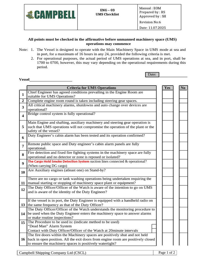 All points must be checked in the affirmative before unmanned machinery space (UMS)