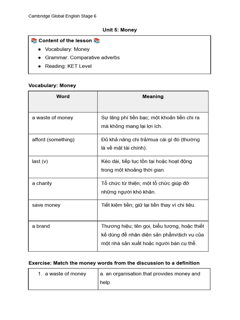 Exercise: Match the money words from the discussion to a definition