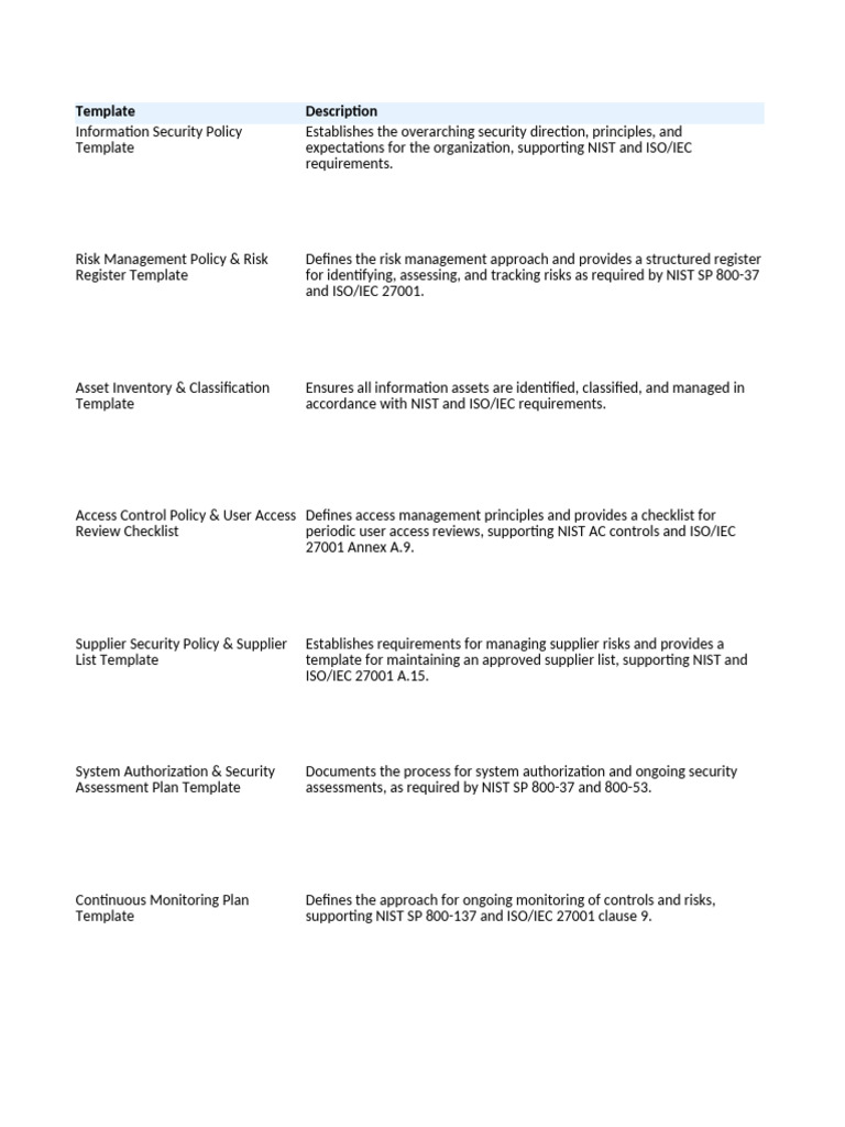 NIST and ISO/IEC requirements. • Records & Evidence (forms/logs to keep) • KPIs &