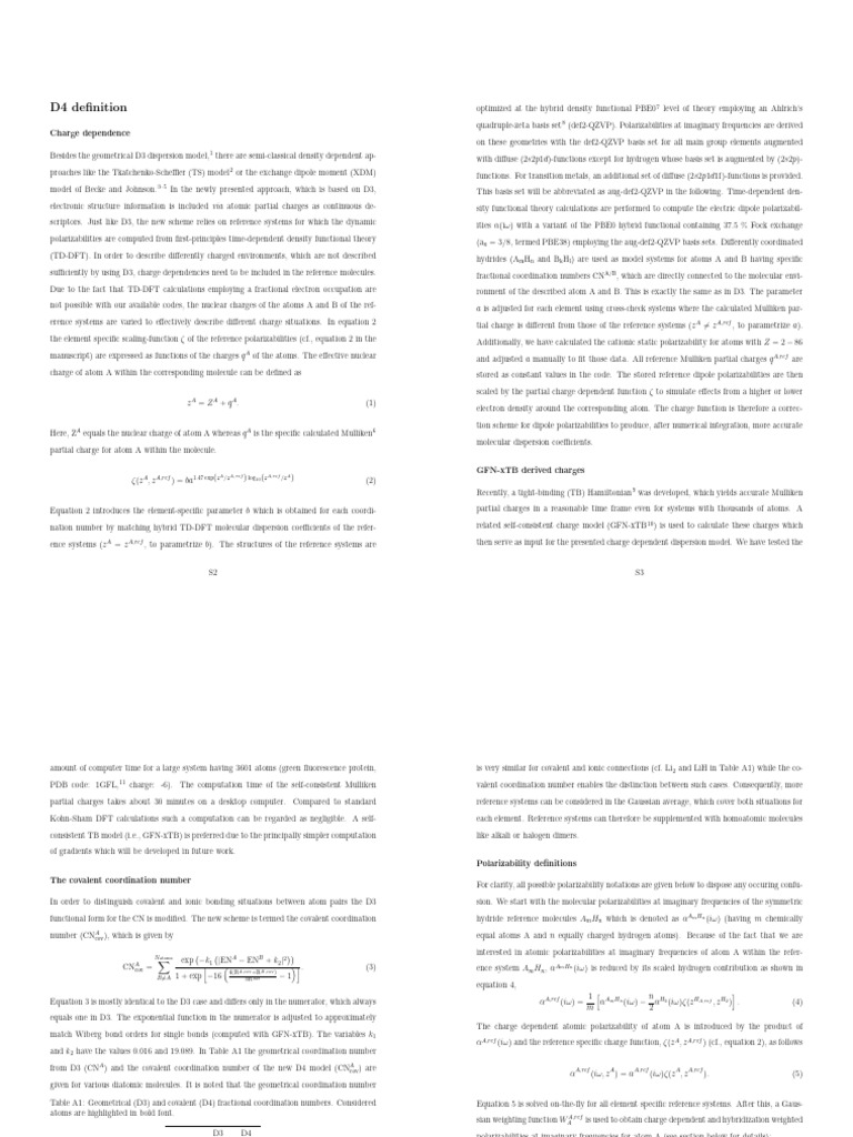 Table A1: Geometrical (D3) and covalent (D4) fractional coordination numbers. Considered Equation 5 is solved on-the-fly for all element specific reference systems. After this, a Gaus-