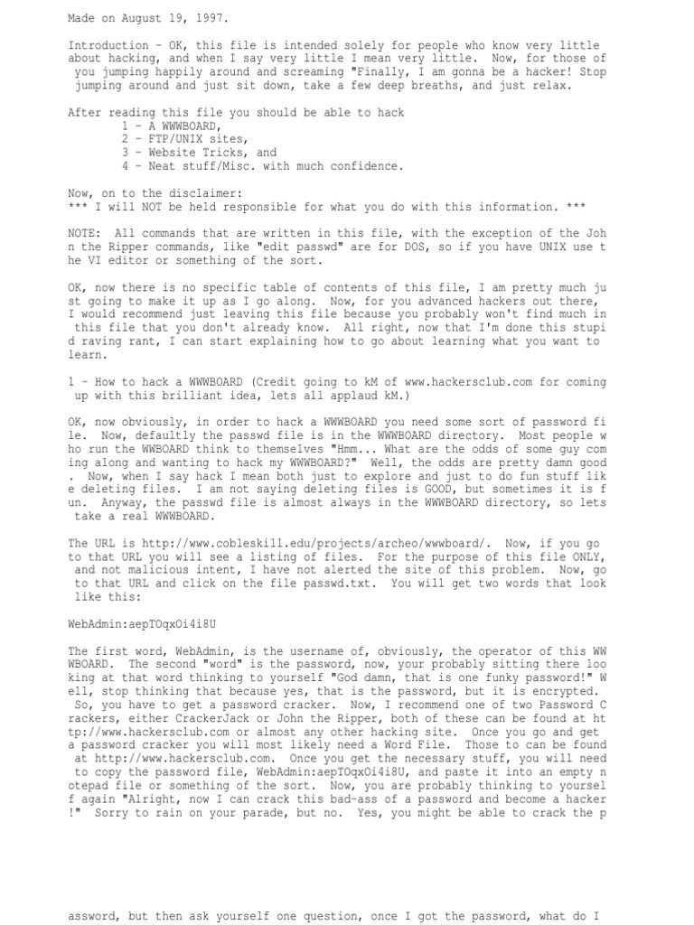 Introduction - OK, this file is intended solely for people who know very little about hacking, and when I say very little I mean very little. Now, for those of you jumping happily around and screaming "Finally, I am gonna be a hacker! Stop jumping around and just sit down, take a few deep breaths, and just relax. After reading this file you should be able to hack 1 - A WWWBOARD, 2 - FTP/UNIX sites, 3 - Website Tricks, and 4 - Neat stuff/Misc. with much confidence. Now, on to the disclaimer: *** I will NOT be held responsible for what you do with this information. *** NOTE: All commands that are written in this file, with the exception of the Joh n the Ripper commands, like "edit passwd" are for DOS, so if you have UNIX use t he VI editor or something of the sort. OK, now there is no specific table of contents of this file, I am pretty much ju st going to make it up as I go along. Now, for you advanced hackers out there, I would recommend just leaving this file because you probably won't find much in this file that you don't already know. All right, now that I'm done this stupi d raving rant, I can start explaining how to go about learning what you want to learn. 1 - How to hack a WWWBOARD (Credit going to kM of [Link] for coming up with this brilliant idea, lets all applaud kM.) OK, now obviously, in order to hack a WWWBOARD you need some sort of password fi le. Now, defaultly the passwd file is in the WWWBOARD directory. Most people w ho run the WWBOARD think to themselves "Hmm... What are the odds of some guy com ing along and wanting to hack my WWWBOARD?" Well, the odds are pretty damn good . Now, when I say hack I mean both just to explore and just to do fun stuff lik e deleting files. I am not saying deleting files is GOOD, but sometimes it is f un. Anyway, the passwd file is almost always in the WWWBOARD directory, so lets take a real WWWBOARD. The URL is [Link] Now, if you go to that URL you will see a listing of files. For the purpose of this file ONLY, and not malicious intent, I have not alerted the site of this problem. Now, go to that URL and click on the file [Link]. You will get two words that look like this: WebAdmin:aepTOqxOi4i8U The first word, WebAdmin, is the username of, obviously, the operator of this WW WBOARD. The second "word" is the password, now, your probably sitting there loo king at that word thinking to yourself "God damn, that is one funky password!" W ell, stop thinking that because yes, that is the password, but it is encrypted. So, you have to get a password cracker. Now, I recommend one of two Password C rackers, either CrackerJack or John the Ripper, both of these can be found at ht tp://[Link] or almost any other hacking site. Once you go and get a password cracker you will most likely need a Word File. Those to can be found at [Link] Once you get the necessary stuff, you will need to copy the password file, WebAdmin:aepTOqxOi4i8U, and paste it into an empty n otepad file or something of the sort. Now, you are probably thinking to yoursel f again "Alright, now I can crack this bad-ass of a password and become a hacker !" Sorry to rain on your parade, but no. Yes, you might be able to crack the p