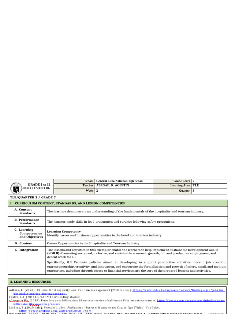 C. Developing and TOPIC: Career Opportunities in Hospitality and Tourism Industry The teacher may download the