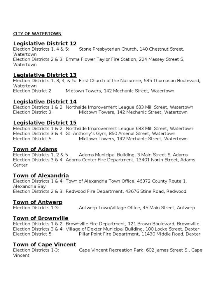 Election Districts 1 & 2: Northside Improvement League 633 Mill Street, Watertown Election Districts 3 & 4 St. Anthonys Gym, 850 Arsenal Street, Watertown Election District 5: Midtown Towers, 142 Mechanic Street, Watertown