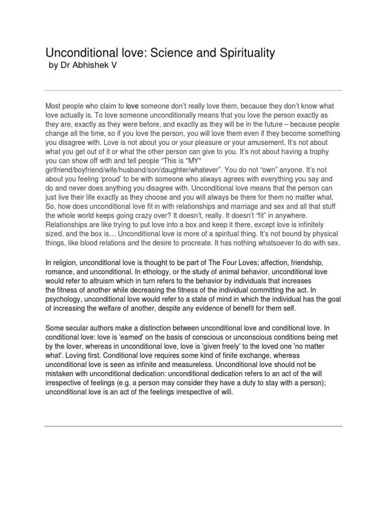 Most people who claim to love someone dont really love them, because they dont know what love actually is. To love someone unconditionally means that you love the person exactly as they are, exactly as they were before, and exactly as they will be in the future because people change all the time, so if you love the person, you will love them even if they become something you disagree with. Love is not about you or your pleasure or your amusement. Its not about what you get out of it or what the other person can give to you. Its not about having a trophy you can show off with and tell people This is *MY* girlfriend/boyfriend/wife/husband/son/daughter/whatever. You do not own anyone. Its not about you feeling proud to be with someone who always agrees with everything you say and do and never does anything you disagree with. Unconditional love means that the person can just live their life exactly as they choose and you will always be there for them no matter what. So, how does unconditional love fit in with relationships and marriage and sex and all that stuff the whole world keeps going crazy over? It doesnt, really. It doesnt fit in anywhere. Relationships are like trying to put love into a box and keep it there, except love is infinitely sized, and the box is Unconditional love is more of a spiritual thing. Its not bound by physical things, like blood relations and the desire to procreate. It has nothing whatsoever to do with sex. In religion, unconditional love is thought to be part of The Four Loves; affection, friendship, romance, and unconditional. In ethology, or the study of animal behavior, unconditional love would refer to altruism which in turn refers to the behavior by individuals that increases the fitness of another while decreasing the fitness of the individual committing the act. In psychology, unconditional love would refer to a state of mind in which the individual has the goal of increasing the welfare of another, despite any evidence of benefit for them self. Some secular authors make a distinction between unconditional love and conditional love. In conditional love: love is 'earned' on the basis of conscious or unconscious conditions being met by the lover, whereas in unconditional love, love is 'given freely' to the loved one 'no matter what'. Loving first. Conditional love requires some kind of finite exchange, whereas unconditional love is seen as infinite and measureless. Unconditional love should not be mistaken with unconditional dedication: unconditional dedication refers to an act of the will irrespective of feelings (e.g. a person may consider they have a duty to stay with a person); unconditional love is an act of the feelings irrespective of will.