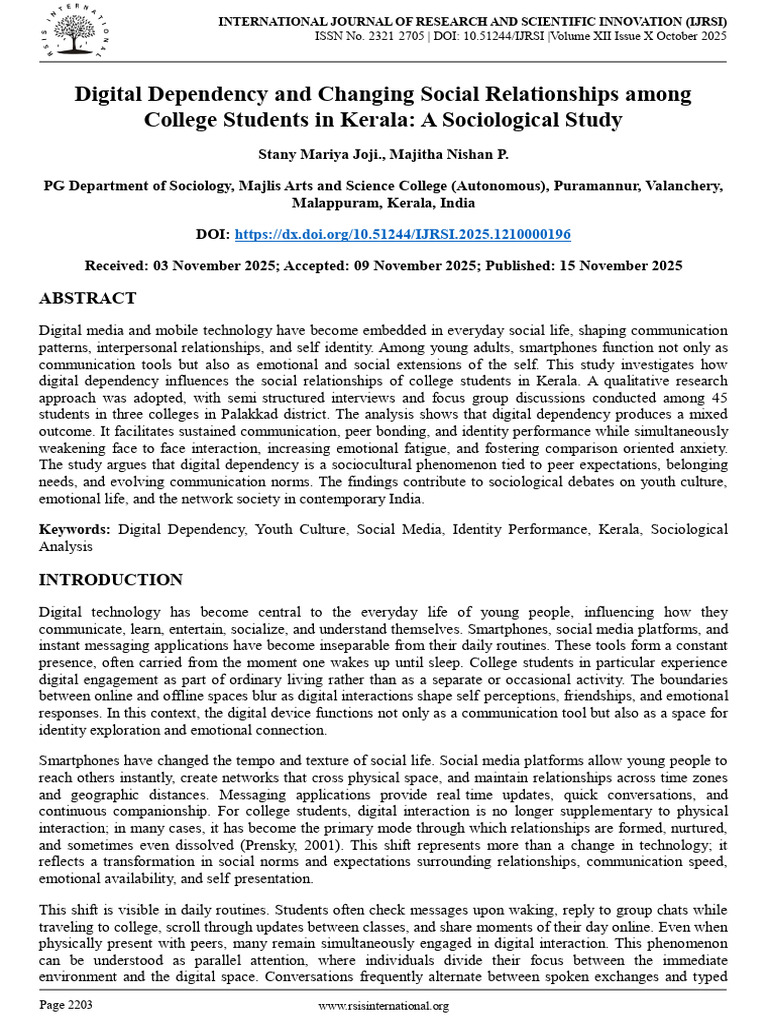 Keywords: Digital Dependency, Youth Culture, Social Media, Identity Performance, Kerala, Sociological