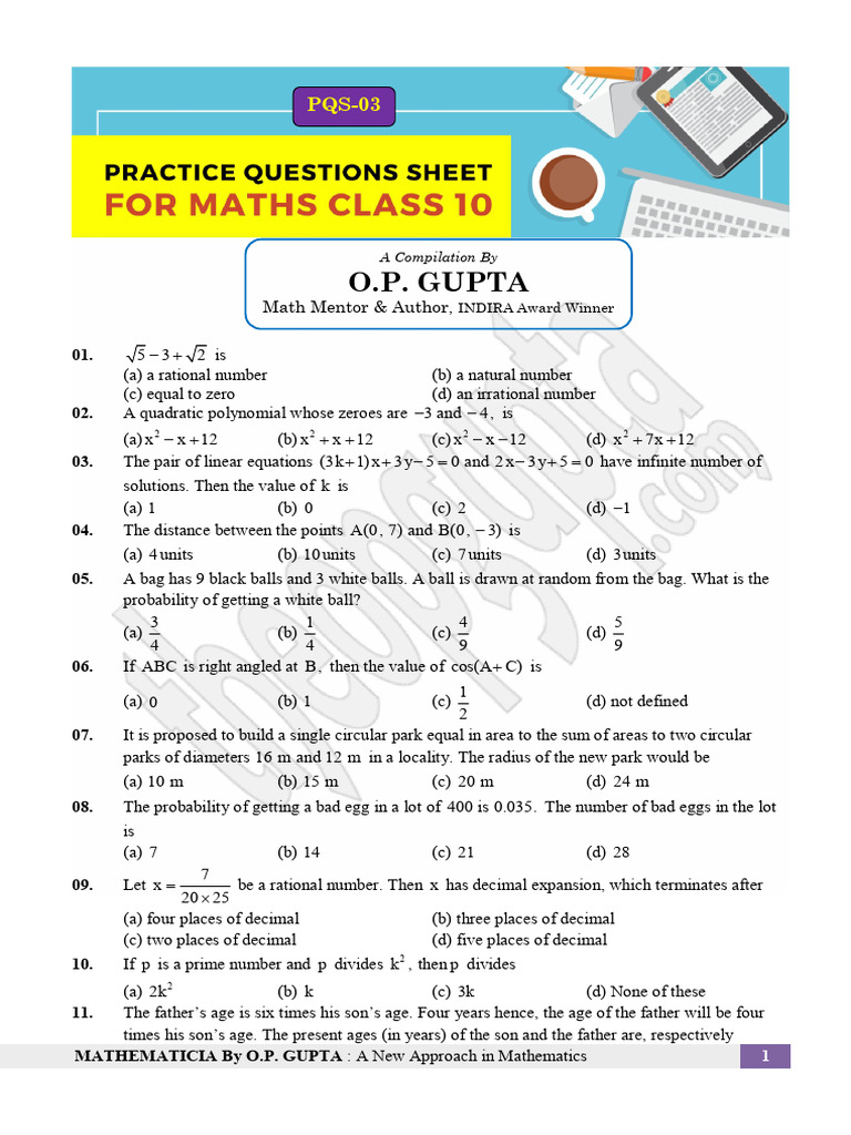 CBSE Practice Questions Sheet for Mathematics By O.P. GUPTA (INDIRA Award Winner)
