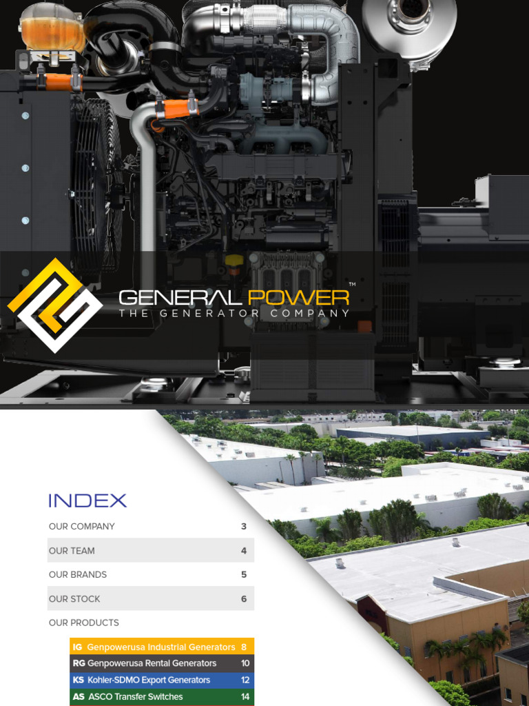from 1 to 3300 kVA. All generating sets are manufactured Americas, General Power carries the largest and most compre-