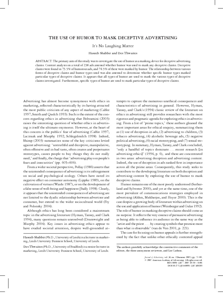 ABSTRACT: The primary aim of this study was to investigate the use of humor as a masking device for deceptive advertising