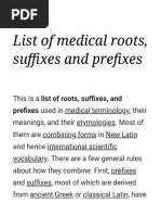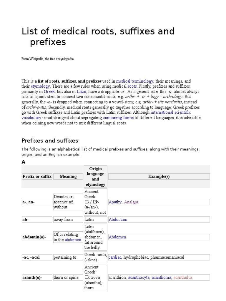 This is a list of roots, suffixes, and prefixes used in medical terminology, their meanings, and their etymology. There are a few rules when using medical roots. Firstly, prefixes and suffixes, primarily in Greek, but also in Latin, have a droppable -o-. As a general rule, this -o- almost always acts as a joint-stem to connect two consonantal roots, e.g. arthr- + -o- + logy = arthrology. But generally, the -o- is dropped when connecting to a vowel-stem; e.g. arthr- + itis =arthritis, instead of arthr-o-itis. Secondly, medical roots generally go together according to language: Greek prefixes go with Greek suffixes and Latin prefixes with Latin suffixes. Although international scientific vocabulary is not stringent about segregating combining forms of different languages, it is advisable when coining new words not to mix different lingual roots.