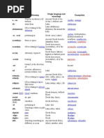 Ancient Greek Epistaxis, epicardium, episclera,e (epi-), before, upon, pidural on, outside, outside of Ancient Greek - (epsion), the pubic area, loins; vulva Ancient Greek (erythros), red Greek Greek Greek Latin Ancient Greek (exo-), outside of, external Latin Eukaryote Exophthalmos Exoskeleton Extradural hematoma Origin language and etymology Latin (facis), the face, countenance Example(s) Facioplegic Fibroblast Latin (forma), form, shape Latin (fossa), ditch, pit Episiotomy
