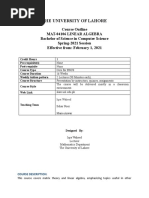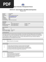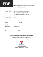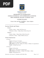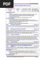 Contents Gradients and Directional derivatives Parametrization of curves, Arc length and surface area of parametrized curves and surfaces. Line integrals, Work, circulation, flux, path independence, conservative field, surface integrals Divergence and curl, Greens theorem, Stokes theorem and Divergence theorem. Vectors in Rn, properties of Rn, dot product, norm and distance properties in Rn, Pyathagorean theorem in Rn, Vector Spaces, Vector Subspaces, Linear independence and dependence, Linear span, Basis of subspaces, Extension to basis. Methods to solve system of linear equations: Gauss elimination, Gauss Jordan method, Elementary row operation, Row reduced echelon form, Inverse of matrices, Row space, Column space, Null space, Rank. Determinants and its properties, Cramers rule. Linear transformation in Rn and basic properties, Linear transformation as Rotation, reflection, expansion, contraction, shear, projection, Matrix of linear transformations, Change of basis and Similarity, Rank Nullity theorem. Inner product space and properties, Angel and orthogonality and normality of basis, Gram Schmidts process, Least squares approximations (linear system) Eigen values and eigen vectors, Caley-Hamilton theorem, Eigen values of orthogonal, symmetric, skew symmetric, hermitian, skew hermitian, unitary and normal matrices, Algebraic and Geometric multiplicity, Diagonalization by similarity transformation, Spectral theorem for real symmetric matrices, Application to quadratic forms.
