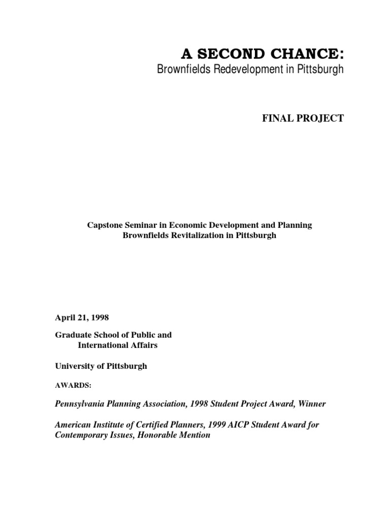 The subject of brownfield redevelopment is wide ranging, and it is one that encourages research by people with a wide variety of interests and experiences. In this class, we each have been able to examine brownfields redevelopment. Our research ranged from big picture information providing background and context pertinent to brownfields revitalization to a more specific focus on brownfield redevelopment in Pittsburgh. Our major findings and conclusions are: Regional policies and practices greatly impact brownfields issues. A regional format is needed to implement a multi-faceted approach to the brownfield issue. There must be an idea branch, which will create a comprehensive development plan for the county. The second branch should act as a clearinghouse, collecting information and tracking interested community groups. Finally, the third branch should be the marketing branch. The abundance and variety of stakeholder groups involved in brownfields redevelopment definitely requires a structured approach in order to take advantage of the benefits these groups can provide and to avoid the pitfalls that might result if not properly managed. Community groups can and should become more active in brownfields redevelopment. We conducted two transactional Phase I investigations, using publicly available resources and meeting with community groups and other actors and have recommendations for public and community officials on both of these sites.