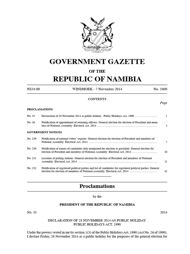 No. 35 Declaration of 28 November 2014 as public holiday: Public Holidays Act, 1990 ................................ 1