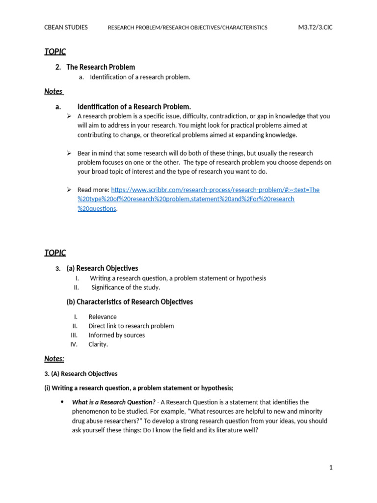 CBEAN STUDIES RESEARCH PROBLEM/RESEARCH OBJECTIVES/CHARACTERISTICS M3.T2/3.