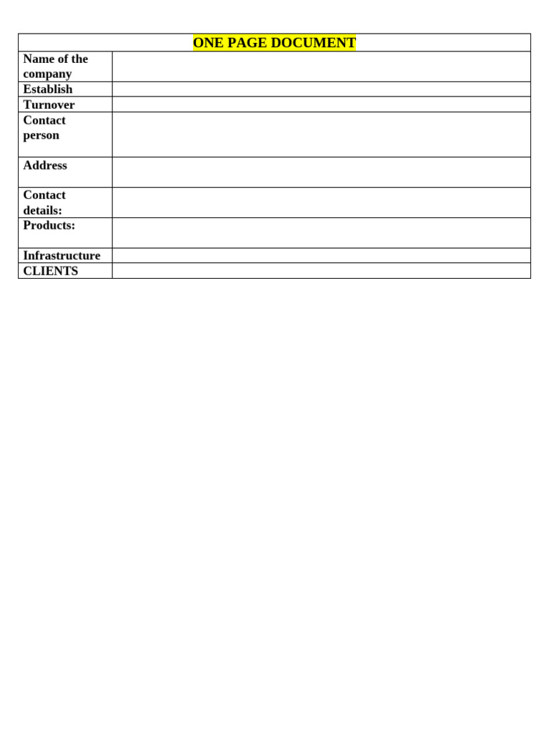 The document outlines key information about a company, including its name, establishment date, turnover, contact person, address, contact details, products, infrastructure, and clients. It is structured to provide a concise overview of the company's essential attributes. However, specific details are not provided in the text.