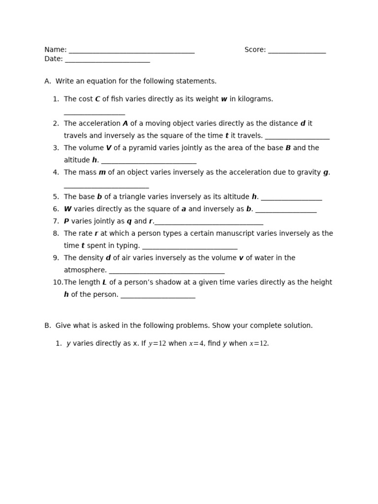 5. The base b of a triangle varies inversely as its altitude h. __________________