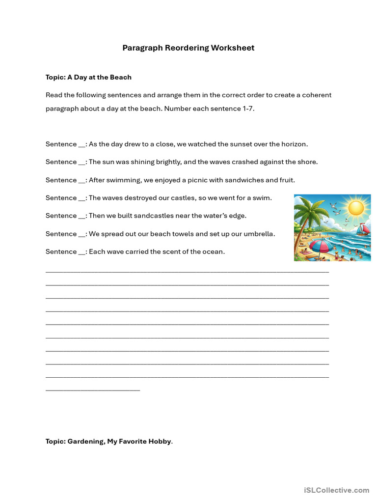 Sentence __: We spread out our beach towels and set up our umbrella.