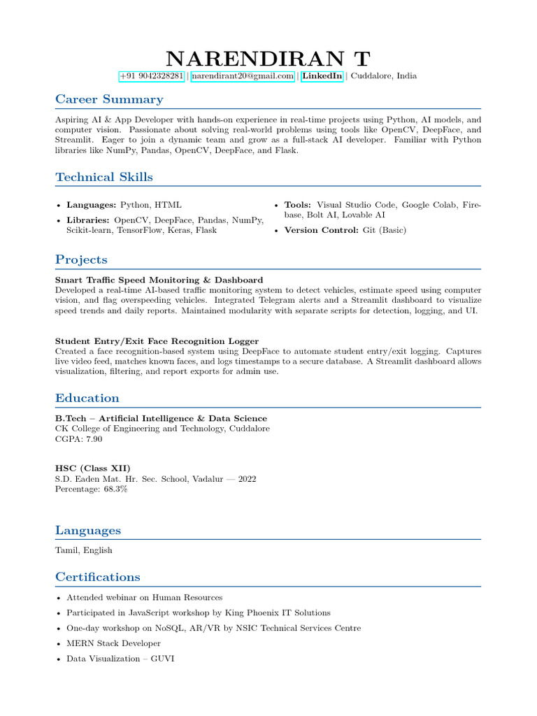 +91 9042328281 | narendirant20@gmail.com | LinkedIn | Cuddalore, India
