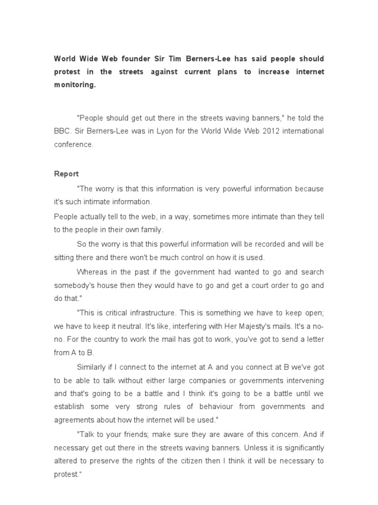 Report "The worry is that this information is very powerful information because it's such intimate information. People actually tell to the web, in a way, sometimes more intimate than they tell to the people in their own family. So the worry is that this powerful information will be recorded and will be sitting there and there won't be much control on how it is used. Whereas in the past if the government had wanted to go and search somebody's house then they would have to go and get a court order to go and do that." "This is critical infrastructure. This is something we have to keep open; we have to keep it neutral. It's like, interfering with Her Majesty's mails. It's a nono. For the country to work the mail has got to work, you've got to send a letter from A to B. Similarly if I connect to the internet at A and you connect at B we've got to be able to talk without either large companies or governments intervening and that's going to be a battle and I think it's going to be a battle until we establish some very strong rules of behaviour from governments and agreements about how the internet will be used." "Talk to your friends; make sure they are aware of this concern. And if necessary get out there in the streets waving banners. Unless it is significantly altered to preserve the rights of the citizen then I think it will be necessary to protest."