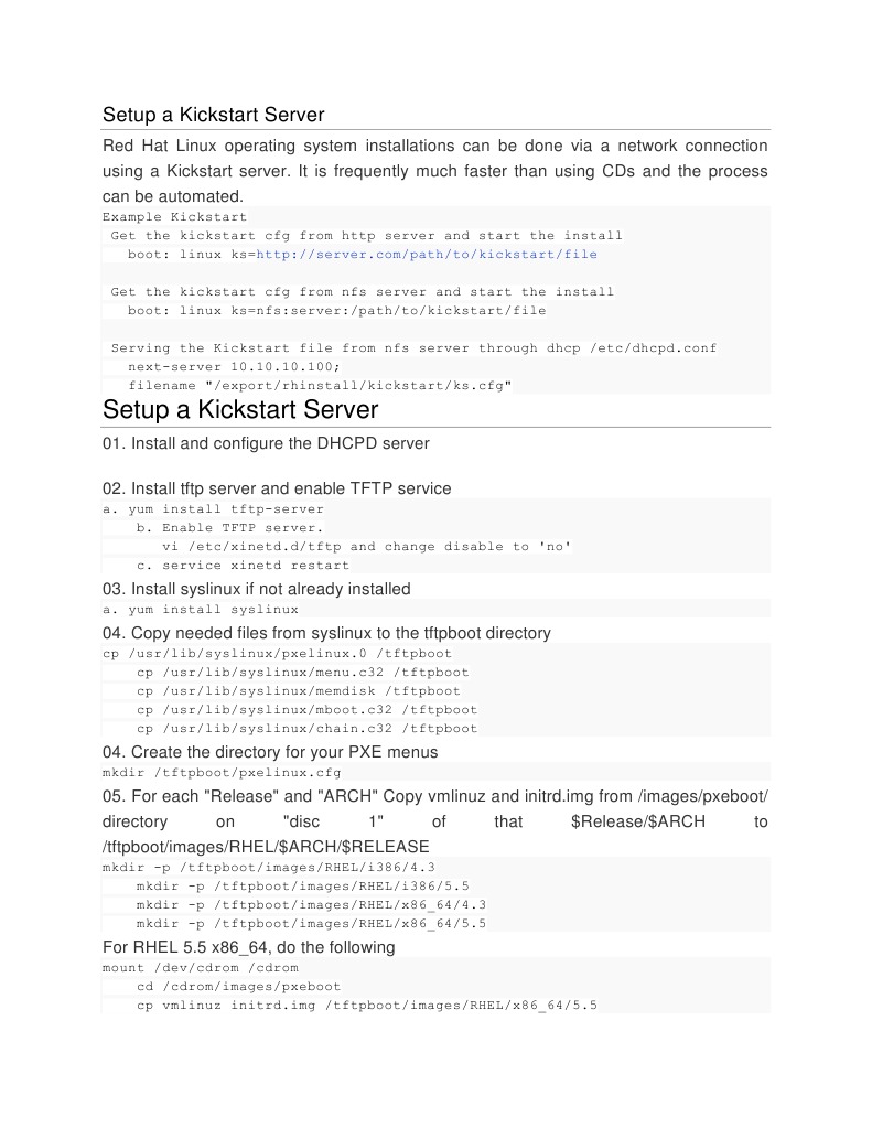 Example Kickstart Get the kickstart cfg from http server and start the install boot: linux ks=http://server.com/path/to/kickstart/file Get the kickstart cfg from nfs server and start the install boot: linux ks=nfs:server:/path/to/kickstart/file Serving the Kickstart file from nfs server through dhcp /etc/dhcpd.conf next-server 10.10.10.100; filename "/export/rhinstall/kickstart/ks.cfg"