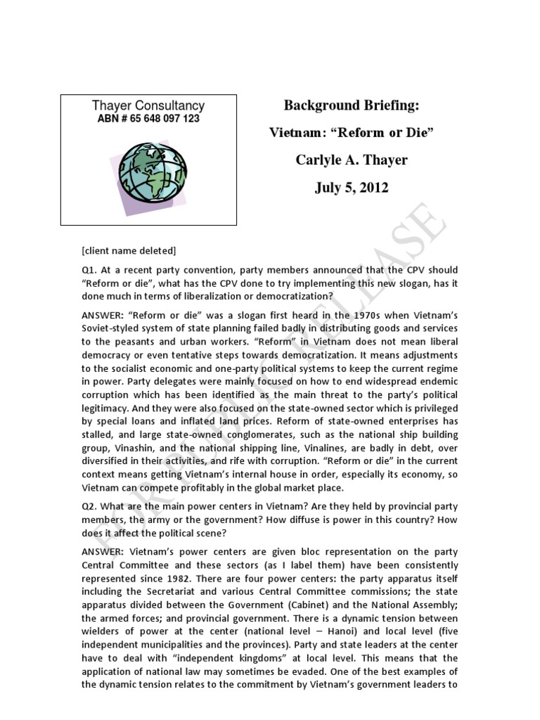 Suggested citation: Carlyle A. Thayer, Vietnam: Reform of Die, Thayer Consultancy Background Brief, July 5, 2012.
