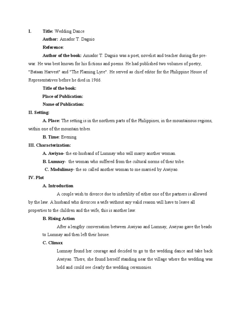 Title: Wedding Dance Author: Amador T. Daguio Reference: Author of the book: Amador T. Daguio was a poet, novelist and teacher during the pre-