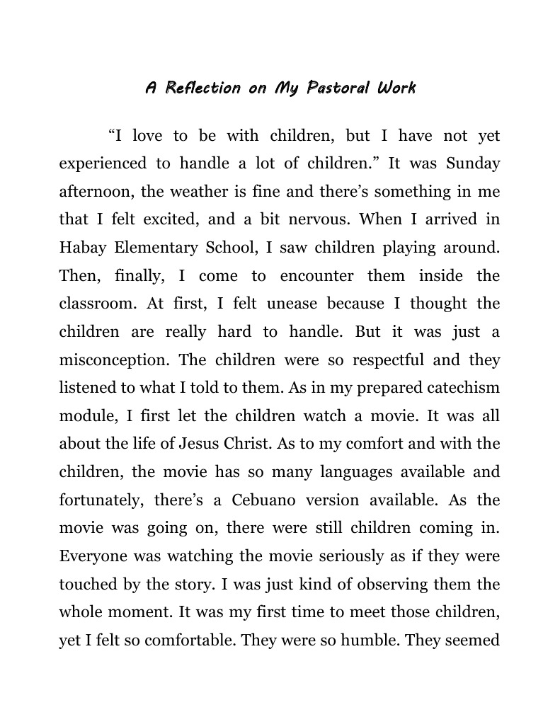 A Reflection on My Pastoral Work I love to be with children, but I have not yet experienced to handle a lot of children.