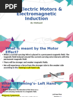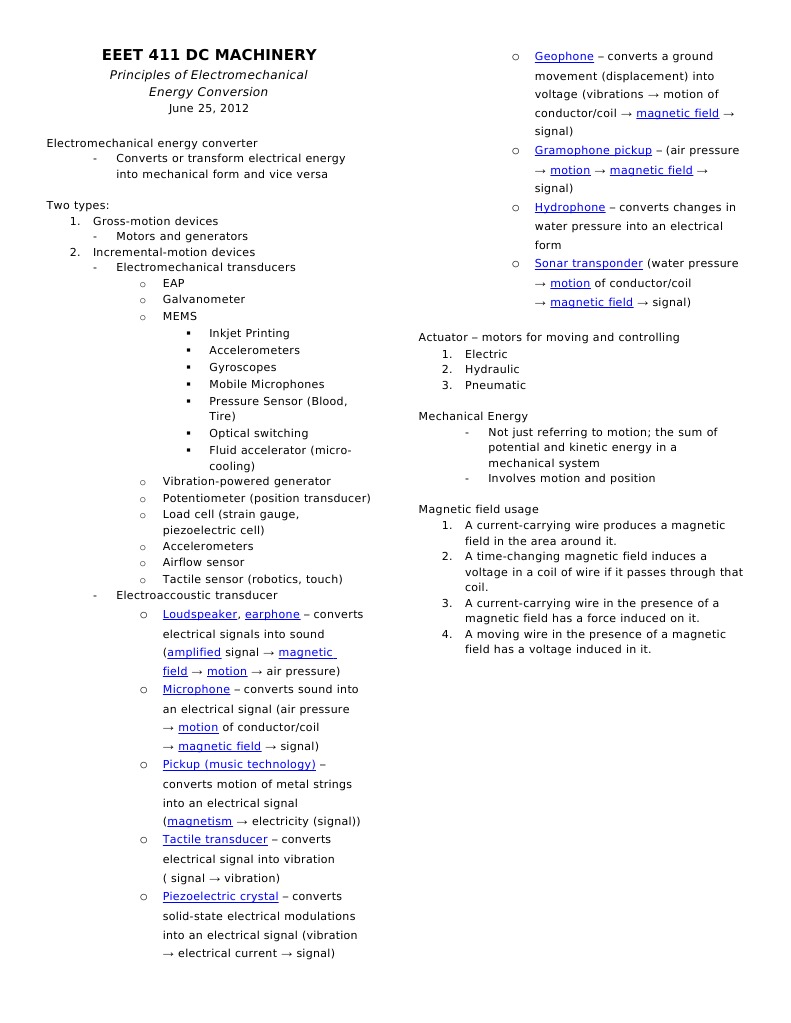 Actuator motors for moving and controlling 1. Electric 2. Hydraulic 3. Pneumatic Mechanical Energy Not just referring to motion; the sum of potential and kinetic energy in a mechanical system Involves motion and position Magnetic field usage 1. A current-carrying wire produces a magnetic field in the area around it. 2. A time-changing magnetic field induces a voltage in a coil of wire if it passes through that coil. 3. A current-carrying wire in the presence of a magnetic field has a force induced on it. 4. A moving wire in the presence of a magnetic field has a voltage induced in it.