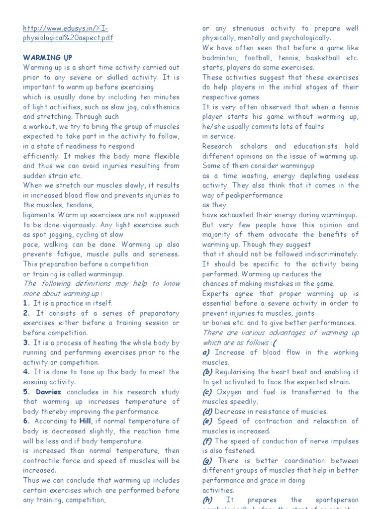 PHYSIOLOGICAL BASIS OF WARMING UP When we observe the contraction and relaxation of an isolated muscle, we note that when the muscle is warmed, the speed with which the muscle contracts and relaxes and the force of contraction are increased. We can see that when a muscle is stimulated repeatedly, then the first few contraction are small and the feeling of relaxation is not satisfying. Whereas, when the contractions become stronger the feeling of relaxation is also complete. This points to the fact that warming up does produce physiological changes in the working of a muscle and that warming up helps in building a strong and efficient formation for the working of muscles. The Physiological basis of Warming Up are as follows : 1. Increases the Body Temperature. A proper warmingup increases the body and muscle temperature locally which helps in the efficiency of contractions and relaxation of muscles. So it has a lot of benefits for the sportspersons. Researches point that if the muscles have been slightly warmedup just before the beginning of activity the performance is greatly improved. If one fails to do warmup exercises before vigorous activity it may lead to tearing of muscle fibres. 2. Decreases the Viscosity of Muscles. Warmingup decreases the viscosity of muscles. It is find out that if a previously inactive muscle is stimulated repeatedly, the first few contractions are often small and irregular and relaxation is incomplete. But once the contractions become stronger relaxation is complete. It takes place due to decrease in the viscosity of muscles. This leads to faster and efficient rate of muscular contraction and relaxation. It also reduces the occurrence of injury or wear and tear of muscles and ligaments. 3. Increases the Speed of Nerve Impulses. Warmingup