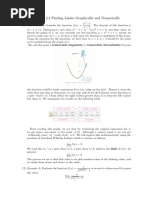 Something similar works for the Dirichlet function, except that instead of using 1 and 1, we use 1 and 0. And, the main point that needs to be made for the Dirichlet function is that any open interval, no matter how small, contains innitely many rational numbers and innitely many irrational numbers. 5. Stability of limit 5.1. Statement of the problem. Let f be a function dened on some open interval (c p, c + p). Now change the value of f at a nite number of points x1 , x2 , . . . , xn and call the resulting function g. Show that if limxc f (x) = L, then limxc g(x) = L. 5.2. Meaning of the problem. Heres what the problem means. We start with some function f . For simplicity you can just imagine f to be a continuous function a wiggly wavy curve where the x-value varies in the interval (c p, c + p). Now, we choose a few points at random and just move the value of the function. So, if say f (5) = 7, and we dont like that, we just move the value to 9, creating a hole at the point 7 here and lling in the poitn at 9. And we do this for nitely many points. The new function that we get after we do all these moves, we choose to call g. Note that although the function f that we started with was continuous, g isnt. Of course, it isnt necessray that the function that we start with is continuous either. We could juts start with some function that wiggles and waves and jumps and then move a few values here and there and get a new function that wiggles and waves and jumps. 5.3. What the question asks for, and the intuitive reason it is true. The question says that if the limit limxc f (x) exists and is equal to L, then the limit limxc g(x) also exists and is equal to L. In other words, what this is saying is that the notion of limit is stable under changes of value at only nitely many points. Now, the rst thing you should notice is that if c itself is one of the xi s (i.e., one of the points where we are changing the value of the function) that should make no dierence to the limit. Because, if you recall, the denition of the limit specically excludes behavior at the point where we are taking the limit. The denition says: For every > 0, there exists > 0 such that if 0 < |x c| < , then |f (x) L| < . Note the 0 < part. This basically says that we arent really imposing any condition when x = c. Specically, remember that the set of x satisfying 0 < |x c| < is the set (c , c + ) \ {c}, which is the same as the set (c , c) (c, c + ). So changing the value of the function at c doesnt aect anything. And once weve acknowledged this, well just assume that if c is equal to one of the xi s, we can just throw out that value of xi . In other words, well just assume that we retain only those xi s that are not equal to c. Now, all the other xi s the points where we change the value of the function are far away from c. What do I mean by that? I mean that we can choose a small open interval about c that excludes all the other xi s. (It may be helpful to think of the xi s as bad points that should be excluded from all decent society for being traitors to their function.) And the main idea of limit is that it is intensely local it only matters what is happening really really close to the point.1 So, if all those other points are far away, the value of the function at those points shouldnt aect the value of the limit. 5.4. A reality check: why nitely many? What is the signicance of the fact that we are allowed to change the value of the function at only nitely many points? The thing is that if we are allowed to change the value of the function at innitely many points, then we can aect the limits at some points. The reason is that when we have innitely many points, it may not be possible to avoid all of them. For example, suppose we have a function dened as the constant 5 on (1, 1) and we are interested in the limit at 0. Suppose now that we change the value of the function to the constant 7 at the points 1/2, 1/3, . . . , 1/n, . . . . There are two things you should note: rst, we have changed the value of the function at innitely many points, and second, the value of the function at most points is still 5. So we havent really changed the function all that much. However, even this small change is enough to disrupt the limit at 0. Because now, no matter how small an interval I choose about 0, that interval will contain some of those bad points those points where the denition changed.
