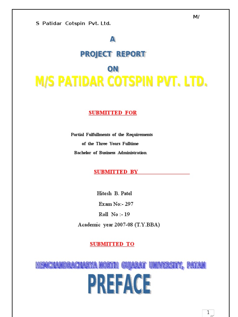 I am pleased to place my report of M/S Patidar Cotspin Pvt. Ltd. Company. This training session is important because in order to develop a practical skill of M.B.A. student. And the information of this project report is collected from the company production unit & office at ahmedabad with the help and discussion with concerned officers and executives of the industrial unit.