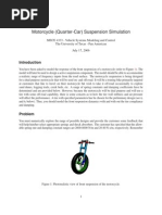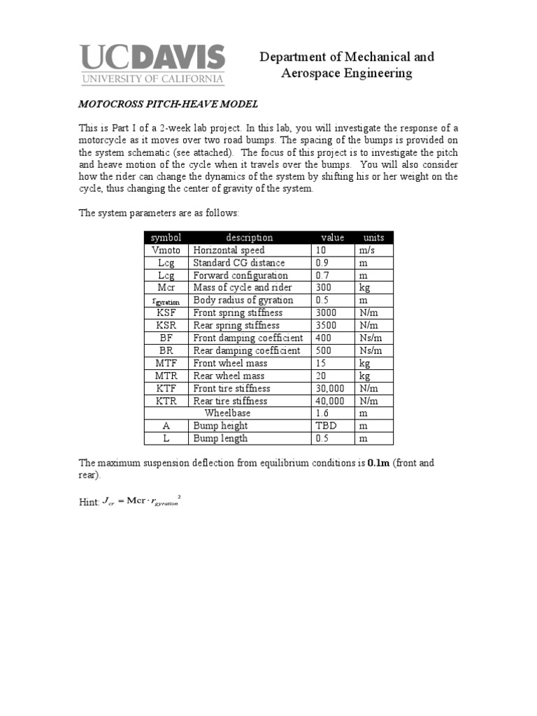 MOTOCROSS PITCH-HEAVE MODEL This is Part I of a 2-week lab project. In this lab, you will investigate the response of a motorcycle as it moves over two road bumps. The spacing of the bumps is provided on the system schematic (see attached). The focus of this project is to investigate the pitch and heave motion of the cycle when it travels over the bumps. You will also consider how the rider can change the dynamics of the system by shifting his or her weight on the cycle, thus changing the center of gravity of the system. The system parameters are as follows: symbol Vmoto Lcg Lcg Mcr rgyration KSF KSR BF BR MTF MTR KTF KTR A L description Horizontal speed Standard CG distance Forward configuration Mass of cycle and rider Body radius of gyration Front spring stiffness Rear spring stiffness Front damping coefficient Rear damping coefficient Front wheel mass Rear wheel mass Front tire stiffness Rear tire stiffness Wheelbase Bump height Bump length value 10 0.9 0.7 300 0.5 3000 3500 400 500 15 20 30,000 40,000 1.6 TBD 0.5 units m/s m m kg m N/m N/m Ns/m Ns/m kg kg N/m N/m m m m