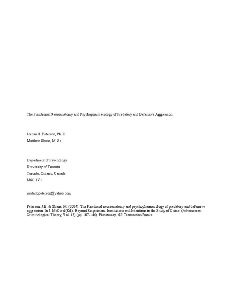 The Functional Neuroanatomy and Psychopharmacology of Predatory and Defensive AggressionJordan B. Peterson, Ph. D.Matthew Shane, M. Sc.Department of PsychologyUniversity of TorontoToronto, Ontario, CanadaM6G 1V1 jordanbpeterson@yahoo.comPeterson, J.B. & Shane, M. (2004). The functional neuroanatomy and psychopharmacology of predatory and defensiveaggression. In J. McCord (Ed.). Beyond Empiricism: Institutions and Intentions in the Study of Crime. (Advances inCriminological Theory, Vol. 13) (pp. 107-146). Piscataway, NJ: Transaction Books.