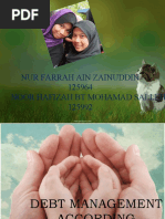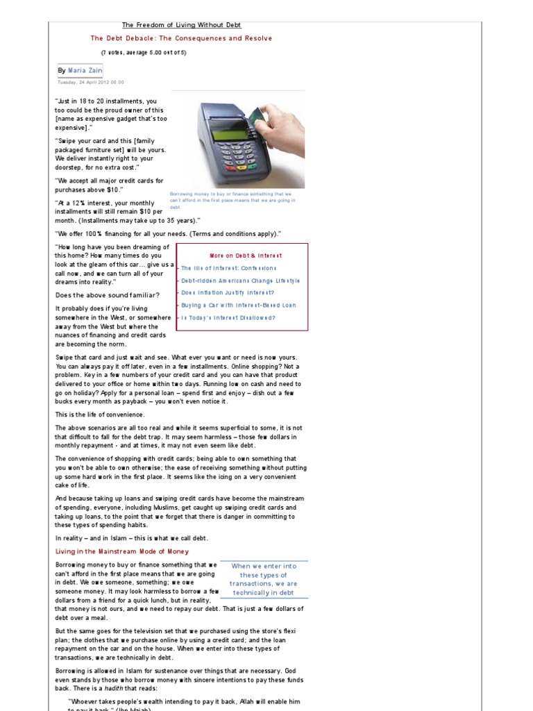 Swipe that card and j ust wait and see. What ever you want or need is now yours. You can always pay it off lat er, even in a few inst allment s. Online shopping? Not a problem. Key in a few numbers of your credit card and you can have t hat product delivered t o your office or home within t wo days. Running low on cash and need to go on holiday? Apply for a personal loan spend first and enj oy dish out a few bucks every mont h as payback you wont even not ice it . This is t he life of convenience. The above scenarios are all too real and while it seems superficial to some, it is not that difficult to fall for t he debt t rap. I t may seem harmless t hose few dollars in mont hly repayment - and at t imes, it may not even seem like debt . The convenience of shopping with credit cards; being able to own somet hing t hat you wont be able t o own otherwise; t he ease of receiving somet hing wit hout put ting up some hard work in t he first place. I t seems like t he icing on a very convenient cake of life. And because taking up loans and swiping credit cards have become the mainst ream of spending, everyone, including Muslims, get caught up swiping credit cards and taking up loans, t o t he point t hat we forget t hat there is danger in committ ing t o these types of spending habit s. I n realit y and in I slam this is what we call debt. Living in the Mainstream Mode of Money Borrowing money to buy or finance somet hing t hat we W hen w e enter int o cant afford in t he first place means t hat we are going these types of in debt . We owe someone, something; we owe transactions, w e are someone money. I t may look harmless t o borrow a few technically in debt dollars from a friend for a quick lunch, but in realit y, that money is not ours, and we need to repay our debt. That is j ust a few dollars of debt over a meal. But t he same goes for the t elevision set that we purchased using t he st ores flexi plan; t he clothes t hat we purchase online by using a credit card; and t he loan repayment on t he car and on t he house. When we ent er int o these types of transact ions, we are t echnically in debt . Borrowing is allowed in I slam for sust enance over t hings that are necessary. God even st ands by t hose who borrow money wit h sincere int ent ions t o pay these funds back. There is a hadit h that reads: "Whoever t akes peoples wealt h intending to pay it back, Allah will enable him t o pay it back." (I bn Maj ah) Prophet Muhammad (peace be upon him) also said: