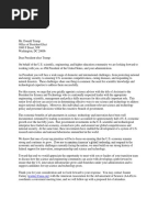 November 23, 2016 Mr. Donald Trump Office of President-Elect 1800 F Street, NW Washington, DC 20006 Dear President-elect Trump: On behalf of the U.S. scientific, engineering, and higher education community we are looking forward to working with you, as 45th President of the United States, and your administration. As President you will face a wide range of domestic and international challenges, from protecting national and energy security, to ensuring U.S. economic competitiveness, curing diseases, and responding to natural disasters. These challenges share one thing in common: the need for scientific knowledge and technological expertise to address them successfully. For this reason, we urge that you quickly appoint a science advisor with the title of Assistant to the President for Science and Technology who is a nationally respected leader with the appropriate engineering, scientific, management and policy skills necessary for this critically important role. This senior level advisor can assist you in determining effective ways to use science and technology to address major national challenges. Moreover, this individual can coordinate relevant science and technology policy and personnel decisions within the executive branch of government. The economic benefits of advancements in science, technology and innovation have been well documented, estimated by leading economists to have accounted for approximately half of U.S. economic growth over the last fifty years. Past government investments in the U.S. scientific and technological enterprise have fueled our economy, created new jobs, and ensured our global competitiveness and national security. At the same time, these investments have enabled the development of a system of U.S. research universities and national laboratories unmatched in the world. We know that one of your top priorities will be to focus on ensuring that the U.S. economy remains strong and continues to grow.