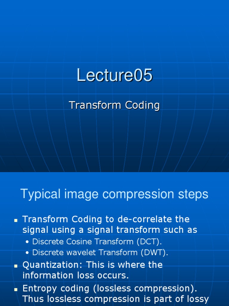There are two types of wavelet transforms (WT): the continuous wavelet transform (CWT) and the discrete wavelet transform (DWT). We will not discuss CWT but we will discuss DWT. The recently developed JPEG2000 standard is based on DWT while the first JPEG standard is based on DCT. The wavelet transform can be used to create smaller and smaller summary images, thus resulting in a Multiresolution Analysis (MRA). When we map a signal from time-domain to frequencydomain, say using Discrete Fourier Transform (DFT), a closely resembled counterpart of DCT, a localization in time results in a spread in frequency and a localization in frequency results in a spread in time, thus resulting in a bad compromise in time-frequency resolution. The wavelet transform represents a signal with a good resolution in both time and frequency.