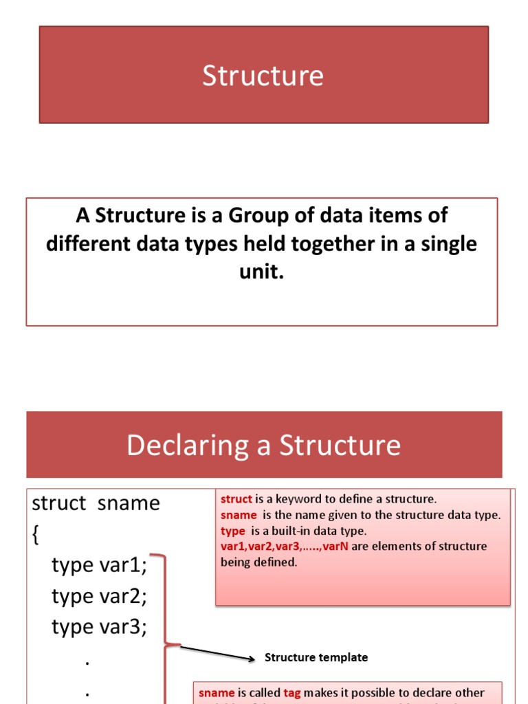 struct is a keyword to define a structure. sname is the name given to the structure data type. type is a built-in data type. var1,var2,var3,..,varN are elements of structure being defined.