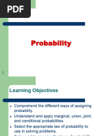 Comprehend the different ways of assigning probability. Understand and apply marginal, union, joint, and conditional probabilities. Select the appropriate law of probability to use in solving problems. Solve problems using the laws of probability including the laws of addition, multiplication and conditional probability Revise probabilities using Bayes rule.