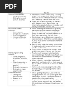 Positive Consequences (rewards): - Praise and verbal compliments - Smiles - High fives - Positive notes - Certificate of - Fun Friday (entire class must earn this) Negative Consequences: - The look warning - Private conversation - Work separately - Fill out think sheet - Call parent or meeting with faculty - Involve the principal as last resort/Referral Please note: in severe cases students will not be given a referral without other warnings.