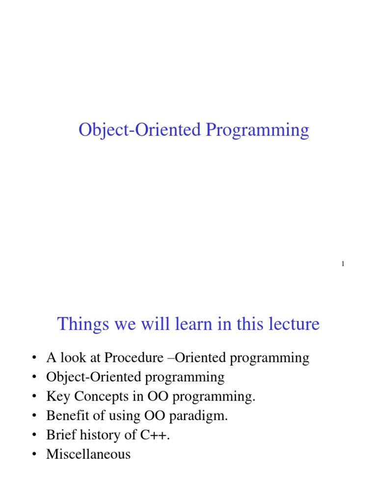 A look at Procedure Oriented programming Object-Oriented programming Key Concepts in OO programming. Benefit of using OO paradigm. Brief history of C++. Miscellaneous