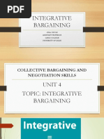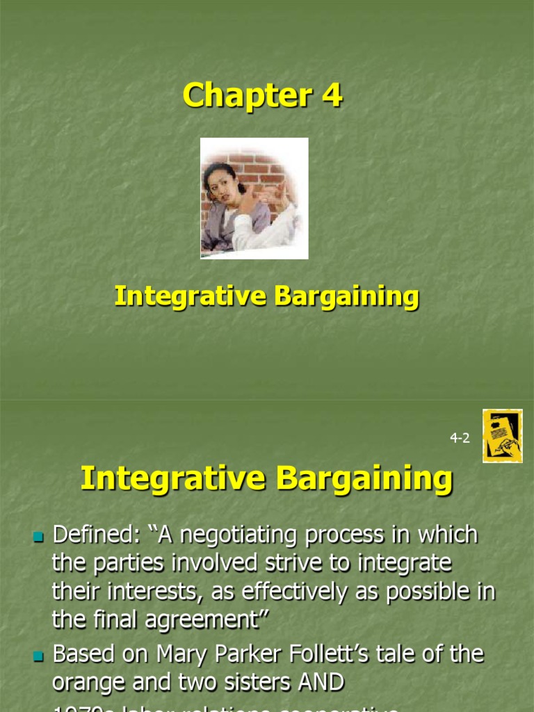 Defined: A negotiating process in which the parties involved strive to integrate their interests, as effectively as possible in the final agreement Based on Mary Parker Folletts tale of the orange and two sisters AND 1970s labor relations cooperative approach to collective bargaining