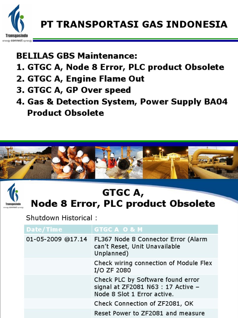 BELILAS GBS Maintenance: 1. GTGC A, Node 8 Error, PLC product Obsolete 2. GTGC A, Engine Flame Out 3. GTGC A, GP Over speed 4. Gas & Detection System, Power Supply BA04 Product Obsolete