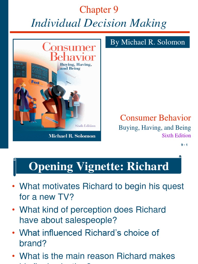 What motivates Richard to begin his quest for a new TV? What kind of perception does Richard have about salespeople? What influenced Richards choice of brand? What is the main reason Richard makes his final selection?