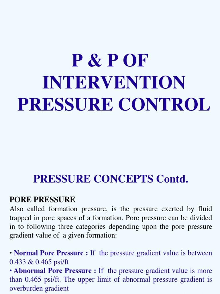 Normal Pore Pressure : If the pressure gradient value is between 0.433 & 0.465 psi/ft Abnormal Pore Pressure : If the pressure gradient value is more than 0.465 psi/ft. The upper limit of abnormal pressure gradient is overburden gradient Sub-normal Pore Pressure : If the pressure gradient value is less than 0.433 psi/ft