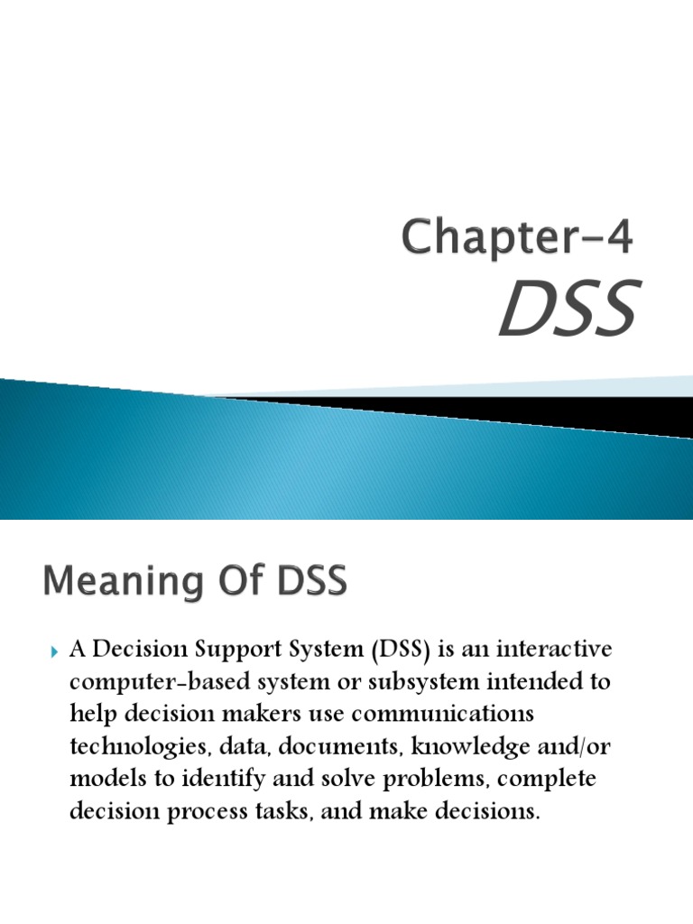 A Decision Support System (DSS) is an interactive computer-based system or subsystem intended to help decision makers use communications technologies, data, documents, knowledge and/or models to identify and solve problems, complete decision process tasks, and make decisions.