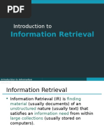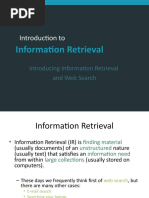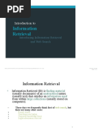 Information Retrieval (IR) is finding material (usually documents) of an unstructured nature (usually text) that satisfies an information need from within large collections (usually stored on computers).